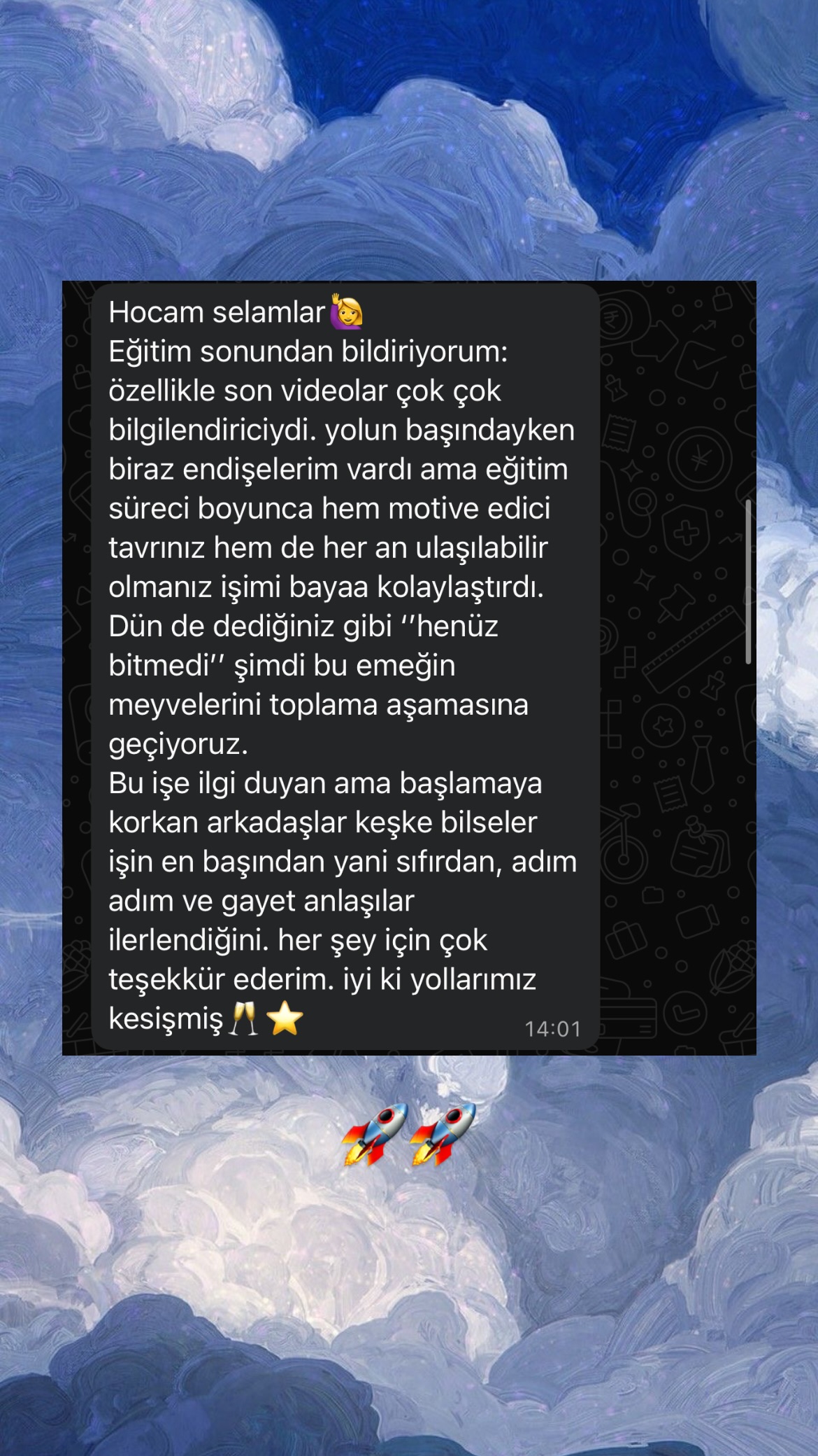 WhatsApp'tan Hemen Yaz →Son Söz: Bu program sana balık tutmayı öğretecek, balık vermeyecek. Kısa yoldan köşeyi dönmek istiyorsan burası sana göre değil. Ama gerçekten öğrenmeye, uygulamaya ve sabırla ilerleyerek Etsy'de sürdürülebilir bir döviz geliri kurmaya hazırsan — doğru yerdesin.